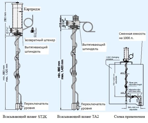 Всасывающие трубки (рукава, шланги) с фильтрами поглотителями паров химических веществ (адсорберами) для газосодержащих жидкостей (ST2K) Всасывающие трубки (рукава, шланги) с фильтрами поглотителями паров химических веществ (адсорберами) для жидкостей не содержащих газ (TA2) : • Регулируемая длина. • Возможно максимум 2 переключателя уровня (из ПВХ или тефлон PTFE). • Реле контроля уровня можно использовать как закрывающий или открывающий клапан, просто перевернув поплавок. • Всасывающие трубки (рукава, шланги) простые в обращении – они просто вставляются в автоцистерну и плотно прикручиваются. • Соединитель обратного потока: G 1/4 ” • Специальная длина по запросу. • Всасывающий патрубок с накидной гайкой + доступна вставка D 16 |